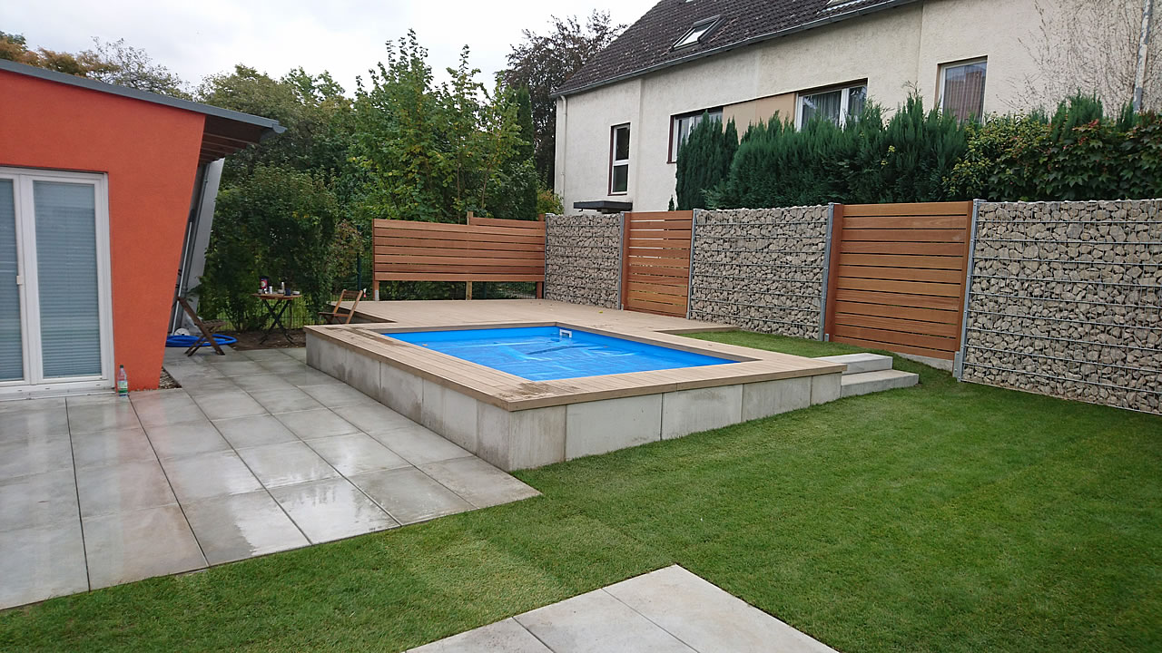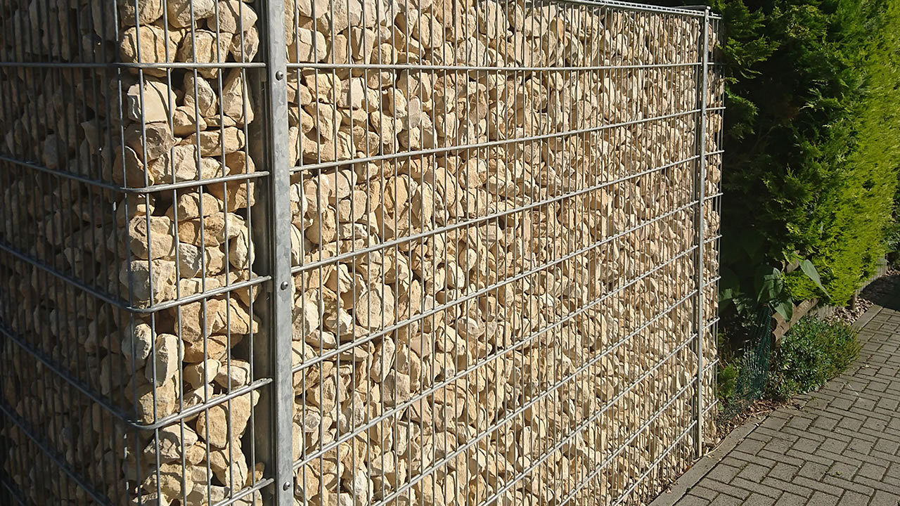 Eine preislich interessante Alternative sind Gabionen, mit Naturstein gefüllte Drahtkörbe. Aufgrund des Gewichts wird hierbei eine solide statische Berechnung benötigt, die den Untergrund mit einbezieht sowie der Bau einer entsprechenden Unterkonstruktion. Sprechen Sie uns bitte an.