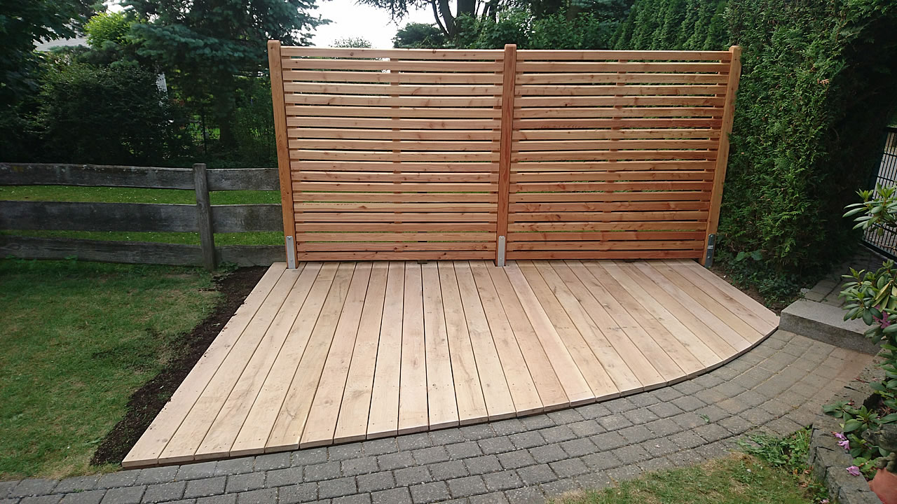 BPC- und WPC-Sichtschutz—Elemente bestehen aus einem Naturfaser-Kunststoff-Gemisch. BPC enthält Bambusfasern, WPC Holz (w=wood). Sie vereinen eine natürliche Anmutung mit der Witterungsbeständigkeit von Kunststoffen. Hier sind besonders viele Farben und Formen kombinierbar.