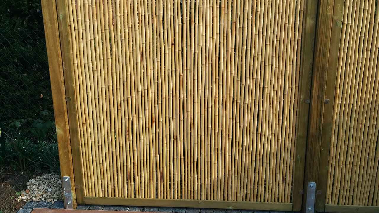 BPC- und WPC-Sichtschutz—Elemente bestehen aus einem Naturfaser-Kunststoff-Gemisch. BPC enthält Bambusfasern, WPC Holz (w=wood). Sie vereinen eine natürliche Anmutung mit der Witterungsbeständigkeit von Kunststoffen. Hier sind besonders viele Farben und Formen kombinierbar.